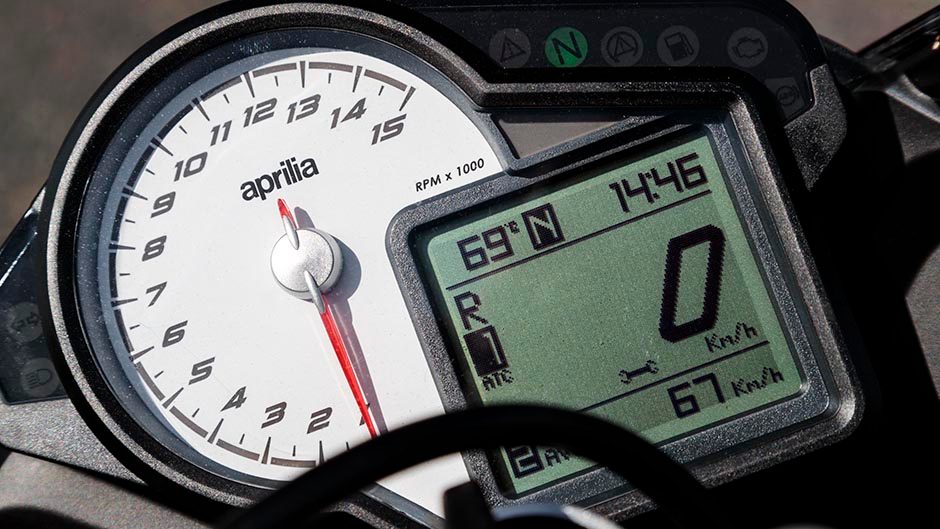 We reckon it’s about time Aprilia did a full redesign of its instrument pod. Revs on the left are clear and legible, but the rest is harder to fathom, even at road legal speeds. And there’s a lot of data packed into a small area too. The electronics now are easier to determine intuitively, meaning a day long intensive tuition course at the Aprilia dealership is no longer necessary.