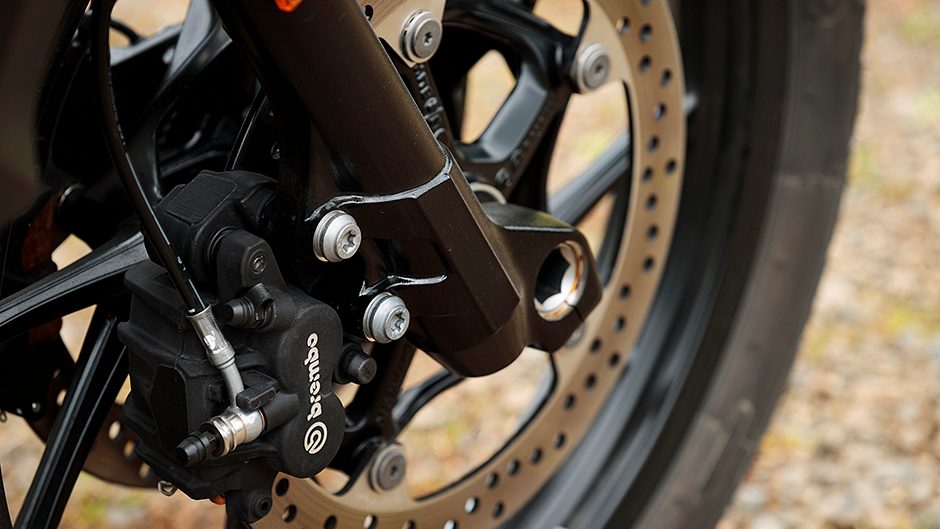 And that’s despite a front 110/90×19 front tyre. Most road bikes get 120/70x17s for a bit more stick. Secondly, the Michelin Anakee tyres are definitely better for street than dirt; nothing nobbly in the slightest about these. And they grip just fine too. Nor are the brakes even of the radial-mount type. So colour this an impressive performance on the retardation front.