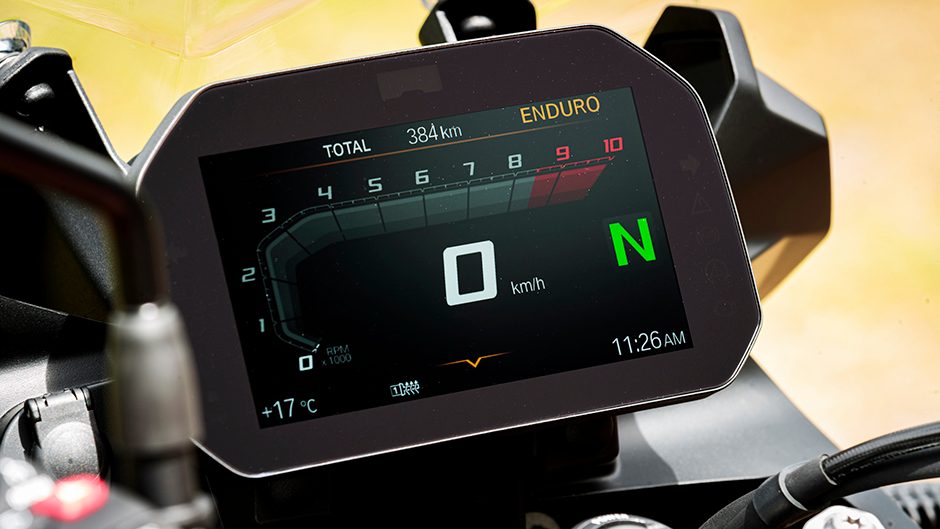 Up the ante to 4000rpm and you’re at 108km/h. It’s higher geared in the top three than before, and lower in the bottom three gears, better for acceleration and dirt work. The gearbox works well too, especially in the upwards direction where the quickshifter makes for seamless changes. It will also do the business downshifting without a clutch but we never bothered, given the changes feel smoother using the traditional method. Both clutch and brake levers are adjustable.