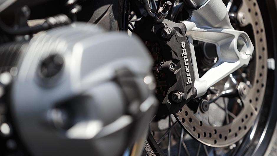 The clutches on older air-cooled boxer twins used to be weak but they certainly aren’t any longer. And shift action is sublime too, even though there’s no quickshift mechanism here. That wouldn’t be retro now, would it? In fact there’s nothing in the way of the usual electronics you find on modern road burners. No traction control, just you and your right wrist. No engine modes, just go or stopped. About the only concession to modernity is ABS braking, and wouldn’t you know it? The R nineT produced the equal-best stopping distance for a non-cruiser machine we’ve recorded, its 37.38m effort overlaying that of a Multistrada which uses monobloc calipers. The BMW merely has radial-mount conventional Brembos.