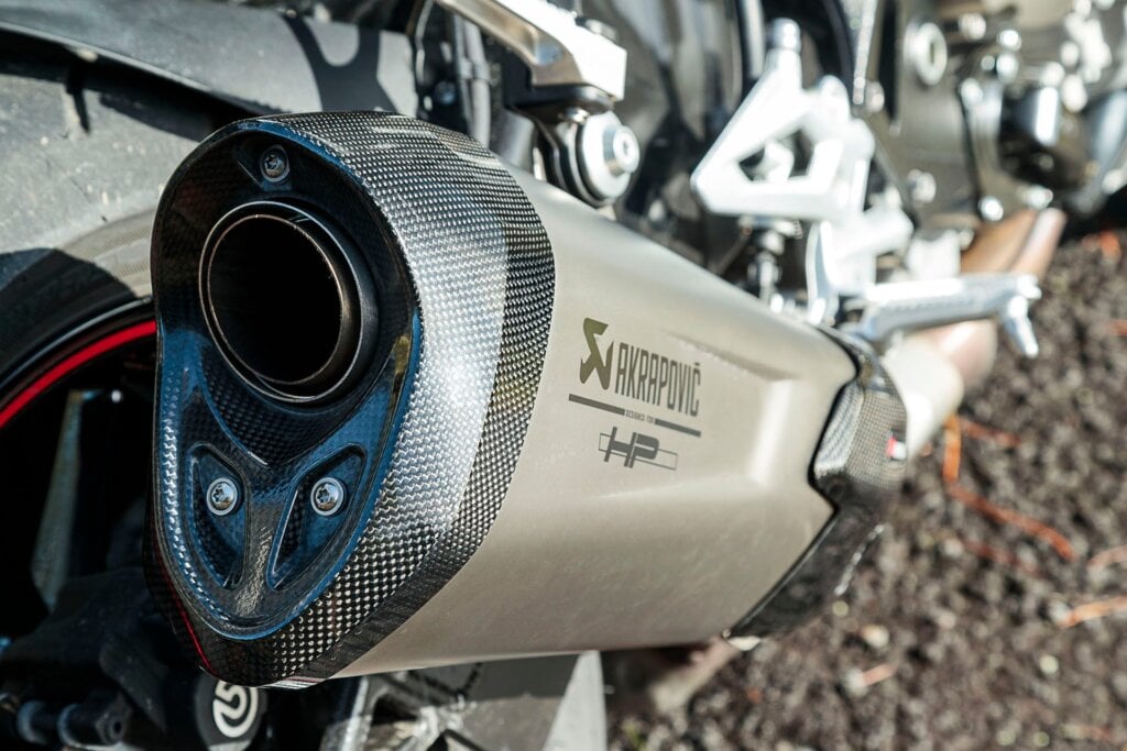 The original model was quite something in a straight line. In America the S 1000 R sits fifth equal on the list of all-time fastest accelerating bikes. Ahead of it are the likes of Yamaha’s muscle bike, the VMAX, our first sub-3 second machine and the Hayabusa. So we knew it would be quick, especially since this latest model gets five more horses and is 3kg lighter. Its twin cam 999cc engine is now good for 165hp at 11,000rpm while peak torque of 114Nm arrives at 9250rpm. The uptick in power output is also associated with a move to Euro4 emissions compliance and as part of that there’s a new muffler, an Akrapovic slip on, that looks lighter than the original and sounds terrific. On overall weight, it’s exactly as promised, weighing in at 205kg fueled.