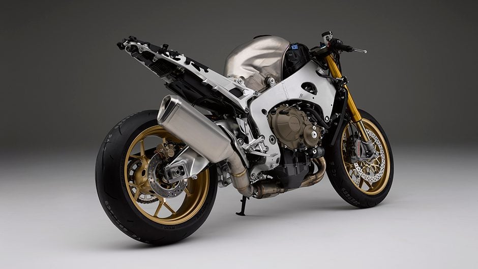 They’ve carved big chunks out of everything so the new Blade even looks smaller! It’s narrower across the front, and the fairing is more compact and made of thinner, lighter fibreglass. Honda has culled 15kg overall, and at 196kg it’s now amongst the lightest of the superbikes. On the SP1 the tank and exhaust are formed of titanium, saving another kg over the RR, though adding some expense. There’s a $5k premium for that, the upgraded Brembos, the bidirectional quickshifter, and the Öhlins suspension, costing $32,995 all up, while the RR goes for $27,995.