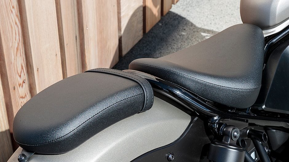 A pity too that the minimal-look seat doesn’t come with more padding. This, as much as the tiny 11L peanut-style tank, will be what forces you to stop first. For the short-travel rear suspension has the back wheel pinging off sharper ruts, which isn’t atypical of any bobber rear end. What price style?