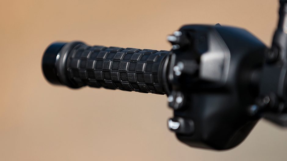 The ‘tank’ which is actually not a fuel holding device – that would be under the seat – is just the right width for gripping with both knees. There’s not much wriggle room on the rider’s seat, so you tend not to lean off it much, but then you don’t need to either, as a bit of bar and peg pressure has the bike turning easily.