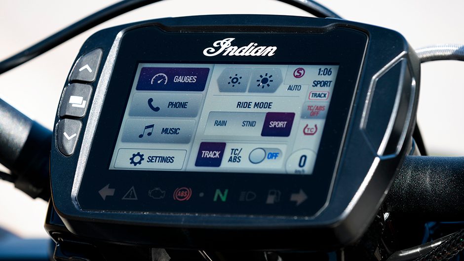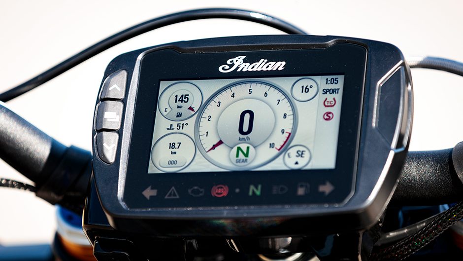 Back to the now though and Indian would probably like this bike to be known affectionately as the Hooligan for there’s an FTR race series in the US that goes by this name. Is it a wild thing? Sure, if you want it to be. Most TC systems stifle attempts at hoisting the front wheel but in second this gets a big rise with little apparent effort. Hit it hard before clutch drop and wheelie mitigation control takes over. Cold running antics aside, once it’s warm the big flat torque curve compensates.