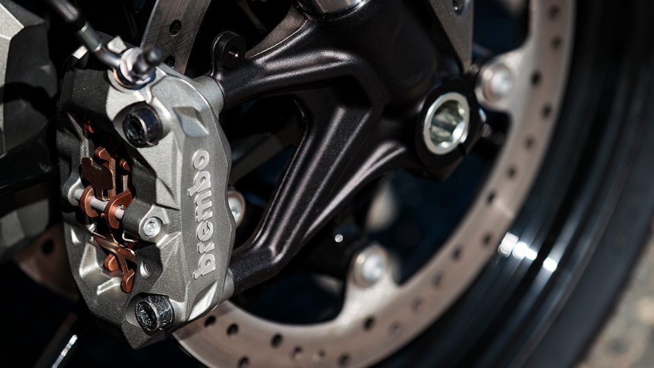 Compared with what the Scout gets this has some pretty serious brakes, Brembos with radial calipers and master cylinder. They’re not the top Brembos but do stop the bike well, getting into the 39m zone under a full ABS stop from 100. Engine braking does most of the slowing, however.