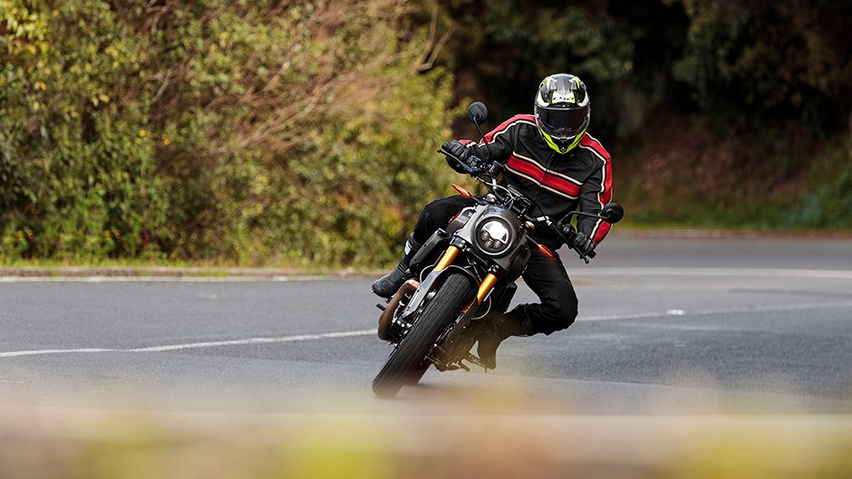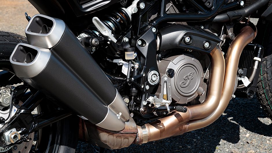 It’s surprisingly tall the FTR, with an 840mm seat height, so it won’t fit all body types. Once mobile, it really doesn’t feel its 240kg, the wide tapered bars facilitating U-turns and a 150/70R18 rear tyre helping to ensure the bike turns quickly. It tracks through corners well, though the Sachs suspension was initially set up quite firm.