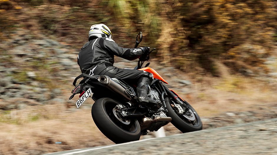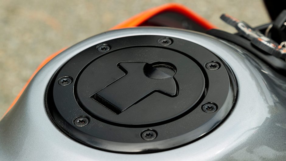 The seat is set at 825mm but there are lower seats available (780-805mm). Hop aboard and the riding position is typically KTM-esque, with no real stretch to the bars or pegs. The latter are set back slightly, supermoto style. And the tank is an ideal width, the knees locking you in place so the arms are relaxed on the go. It’s an open, easygoing position, ideal for urban commuting and an easy bike on which to do that, given its heroic midrange thrust.