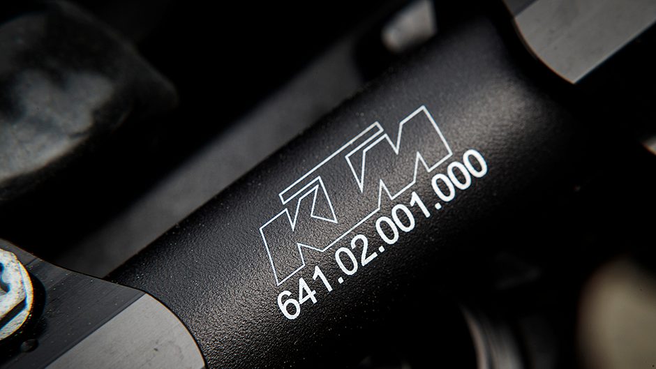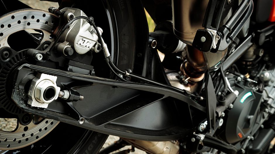 Brakes are KTM branded, the four-piston radial design (including radial master cylinder) emanating from J. Juan, a Spanish brake firm. They’re entirely adequate, if lacking in ultimate sensitivity. They feel solid enough in use but fade with repeated application. Our best stoppie, a 43m effort, we achieved early on, and failed to match thereafter. But they’re up to the task.