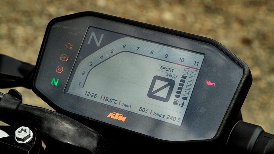 To price the bike competitively KTM has had to make a couple of concessions, but electronics wasn’t one of them. In standard trim it comes with lean angle-sensitive traction control and ABS, engine braking control, and four riding modes (Rain, Street, Sport and Track). A colour TFT screen shows the trip data you need, a fuel gauge, and is clear even in the full light of day.