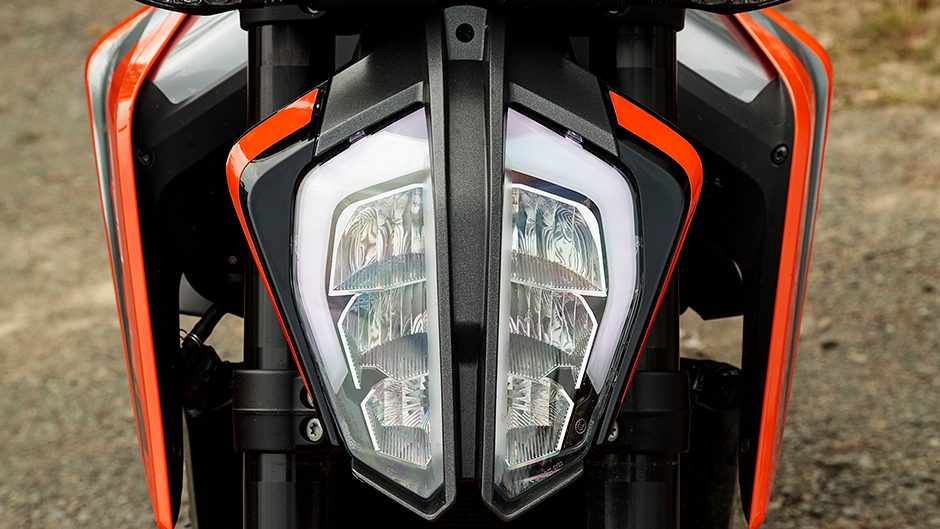 This new compact LC8 twin sports 435-degree firing intervals. And that imbues the engine with an aural signature almost indistinguishable from a V-Twin’s, its off-beat resonant growl punctuated by exhaust bangs on the overrun. V sporty, just like KTM’s politically incorrect message at start-up: Ready to Race.