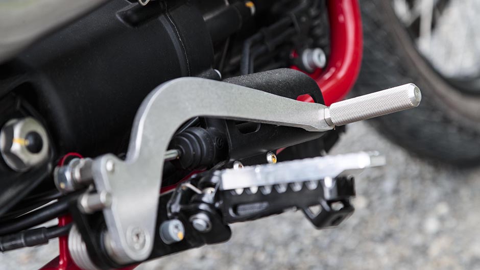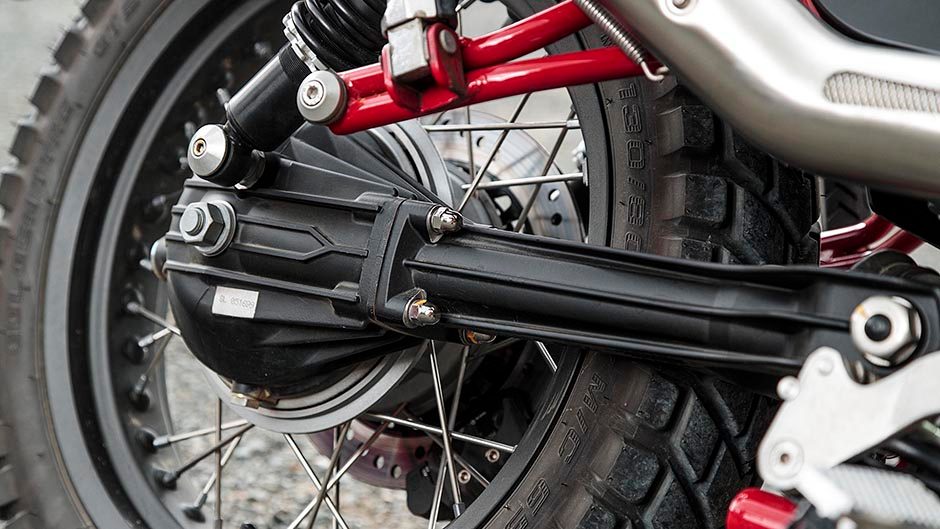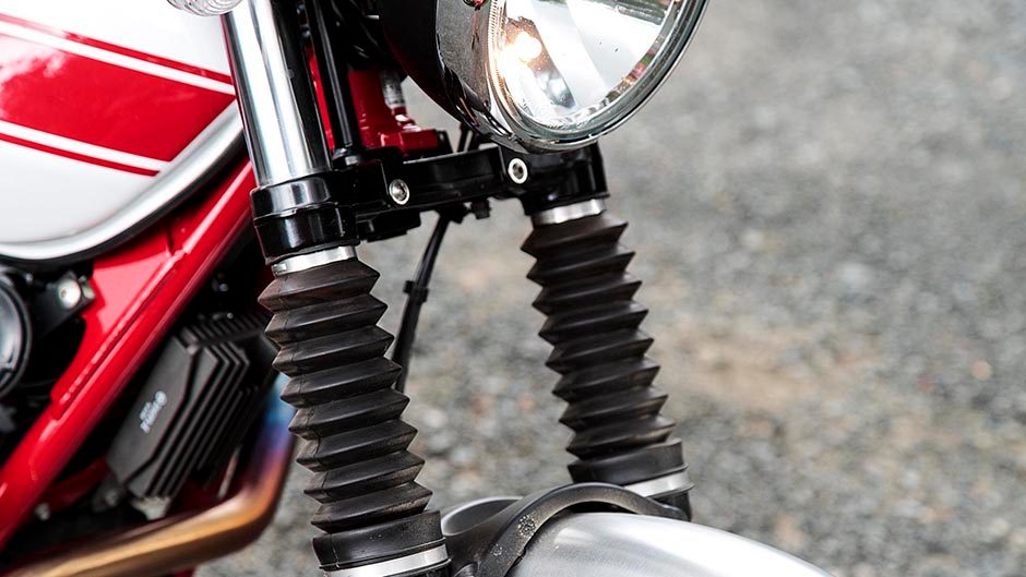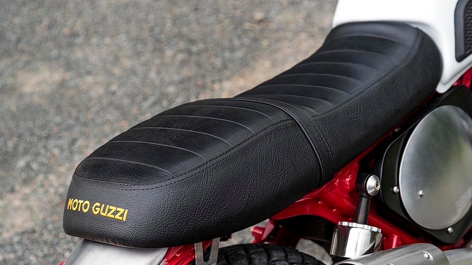 There are the obligatory boots for the fork stanchions which are non-adjustable (the forks, not the gators) and an absolutely gorgeous single-sided high-mount two-into-one Arrow pipe that comes as standard and makes a suitably raucous bark without being too wolfy. Along with spoked wire wheels, rubber tank pads for the knees, polished satin metal mudguards and the nice clean lines of Guzzi’s ubiquitous shaft drive this is one fine looking yesteryear example of the scrambler genre.
