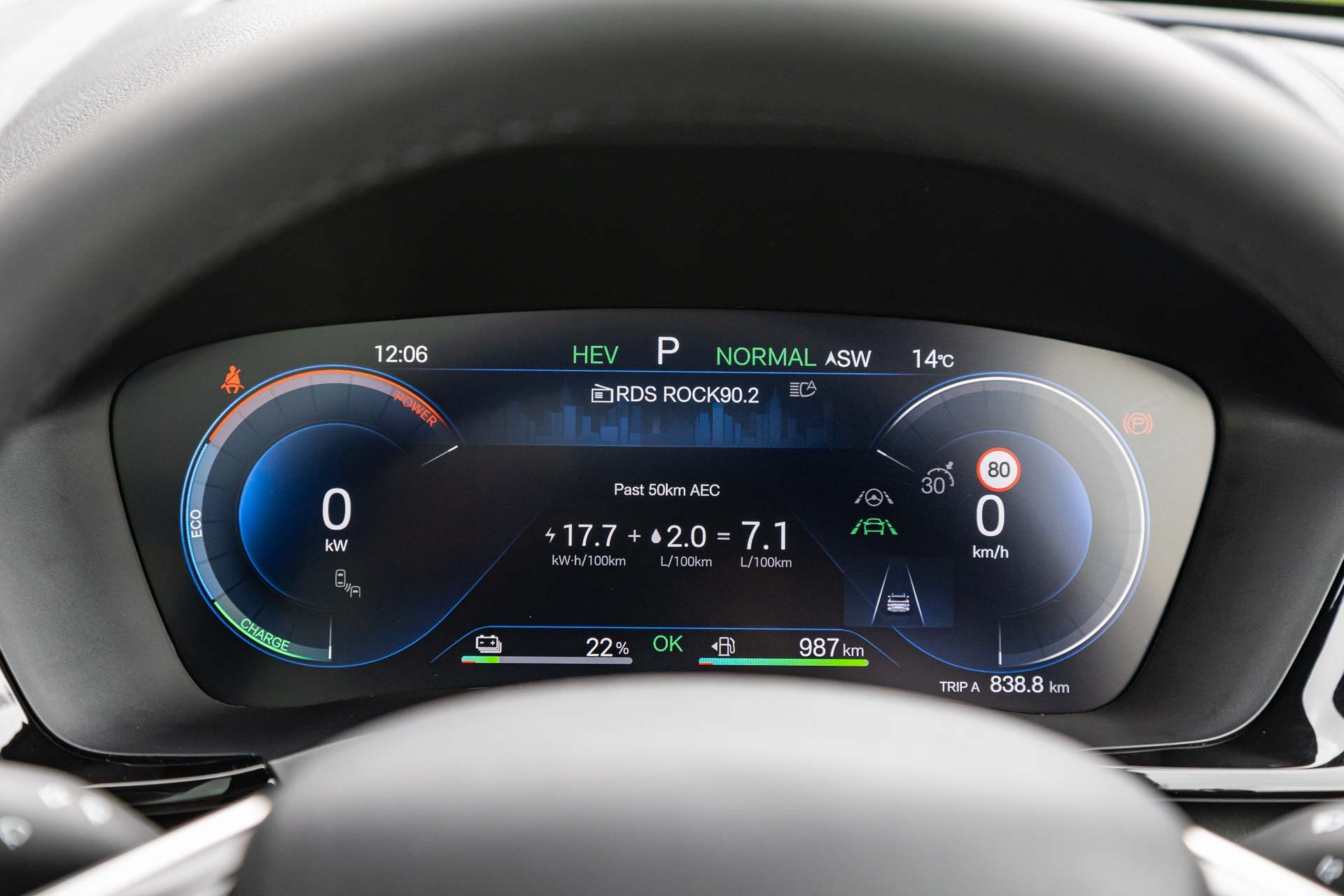 There’s a readout that blends the HEV and EV figures for an equivalent L/100km number that doesn’t quite compute. Another tracks your progress over the past 50km of travel.
