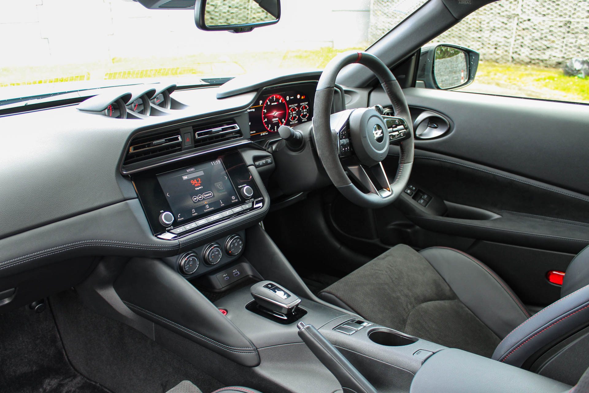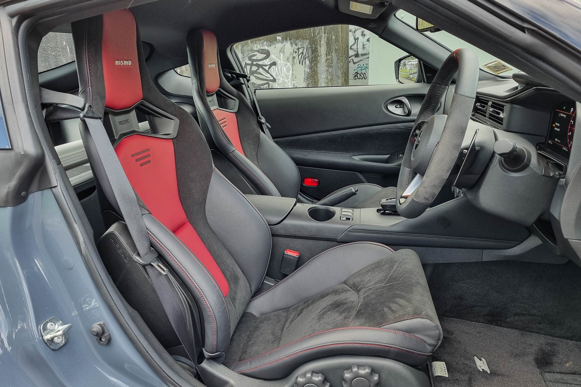 Plonking ourselves into the Nismo’s Recaros, we prod the red go button and the rumble of the V6 awakening is a nice antidote to an EV’s sounds of silence.