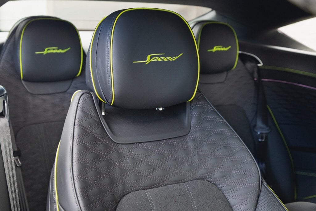 And he’s right, it is a vastly considerable sum but then the GT Speed is quite an exquisite thing…apart perhaps for the hero paint colour. Green is fine in a British Racing hue, but this particular tone, Tourmaline Green, not so much. Still, there are 62 other exterior hues on offer.