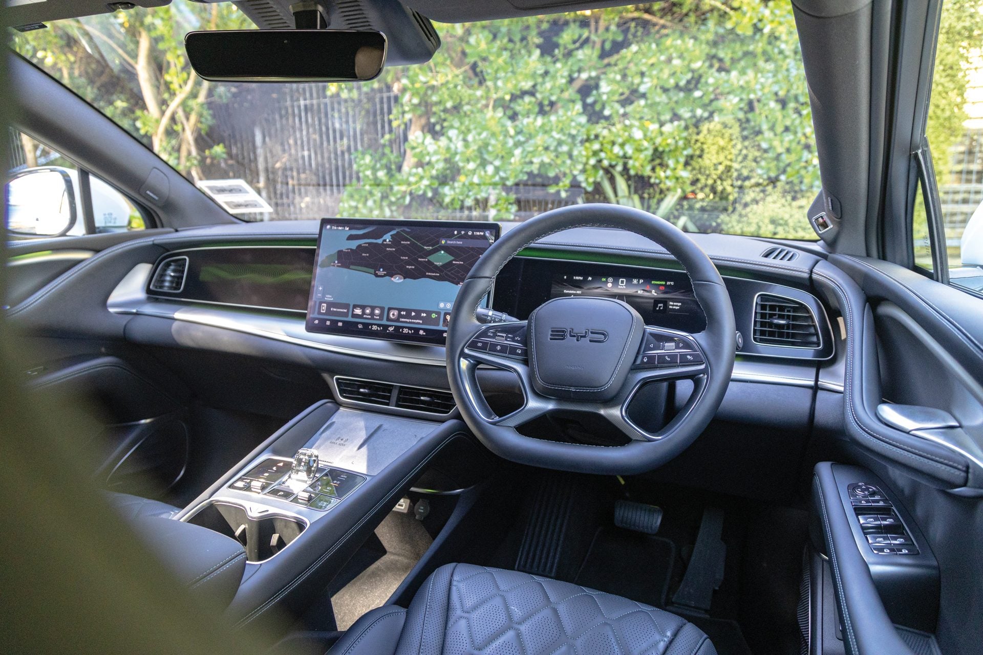 Up front feels a bit special. There’s a huge 15.6-inch rotating central control screen and a flat bottomed, leather-bound wheel.