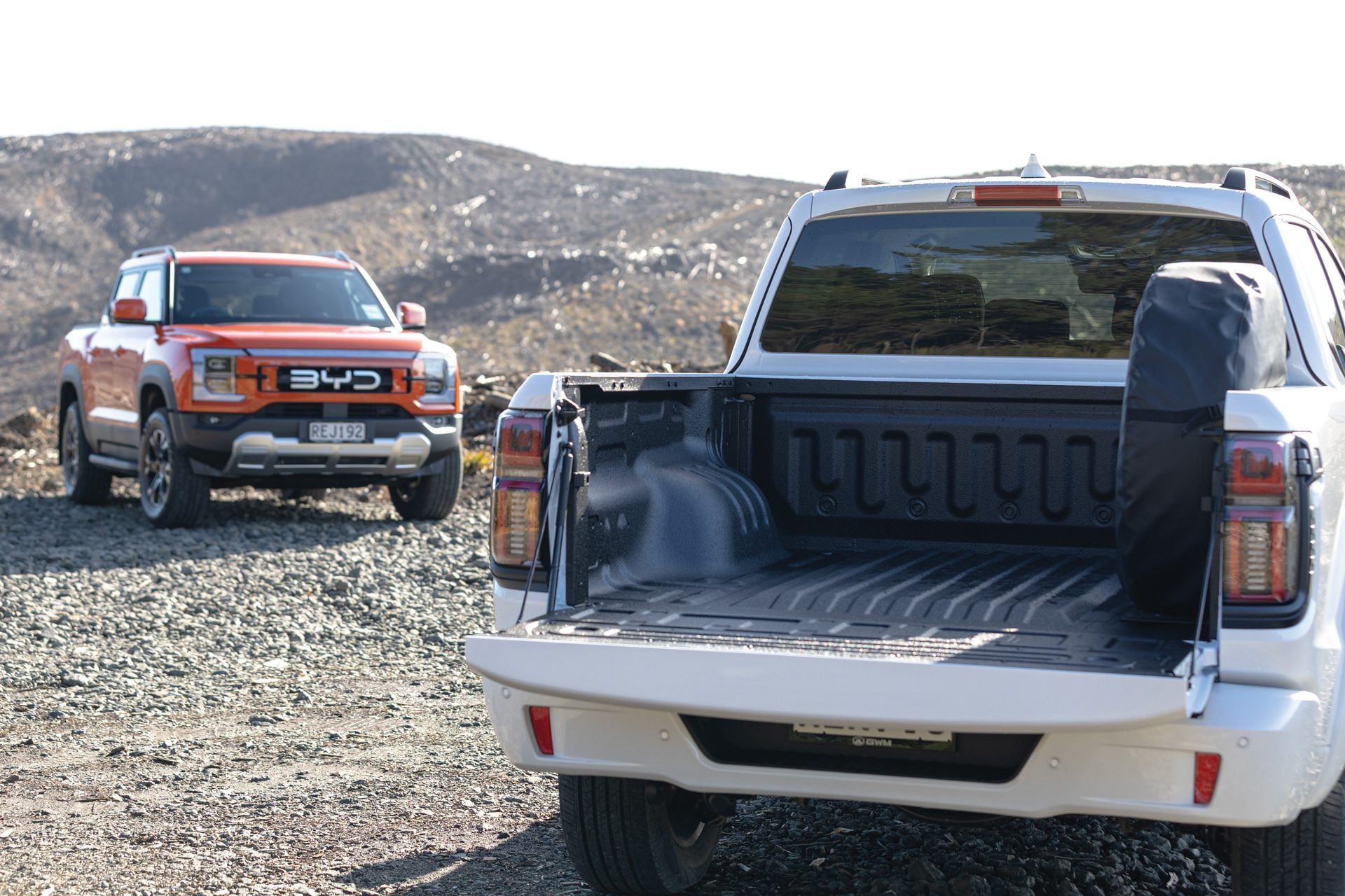 The Shark has a whopper of a tray, measuring 1520mm long and is 1360mm wide at the tailgate and 1200mm between the arches. You might notice a slight issue with the Cannon, that spare wheel eating into the load capacity. There’s no room for it underneath (where you’ll find the Shark’s spare) due to the siting of the battery, which is perched up above the rear axle. That sees a slight rise in the deck floor too. The Alpha’s tray is the same length as the Shark’s (and is slightly wider at the tailgate) but it’s only 1060mm wide with that spare wheel in place, and is 80mm narrower at the arches. As to payload, the Cannon PHEV is rated at 685kg while the Shark 6 has the ability to haul up to 790kg. The Shark’s V2L outlets are handily integrated into the side of the tray, whereas the Cannon has an adapter that needs to be plugged into the charge port. Neither is easily converted from wellside to a flatdeck due to the electrical bits, though BYD says it has cab chassis variants (including single cab options) coming next year.
