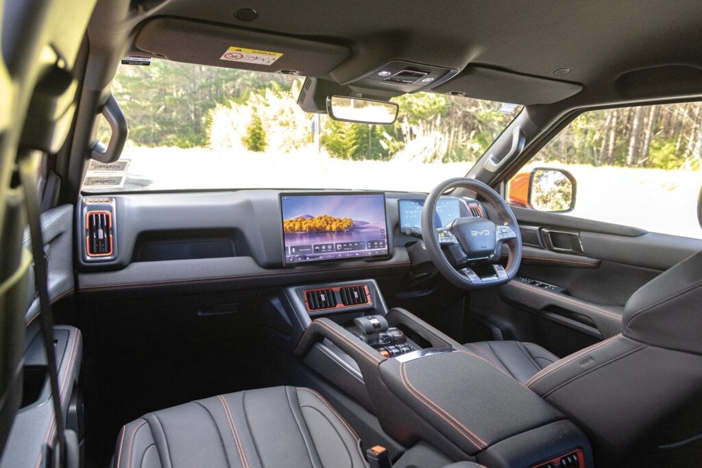 The GWM runs a parallel type set-up, with a 180kW/380Nm 2.0-litre turbopetrol working with a 120kW/400Nm motor that resides in the nine-speed auto’s housing. GWM quotes a total output of 300kW and 750Nm which flows to the rears the same way it would in the ICE-powered Alpha. The PHEV also utilises a torque-on-demand 4WD system, to ensure the outputs stick. The plug-in status allows GWM to quote fuel consumption at 1.7L/100km and BYD 2.0L/100km. Actual consumption varies depending on how fastidious you are at plugging in.