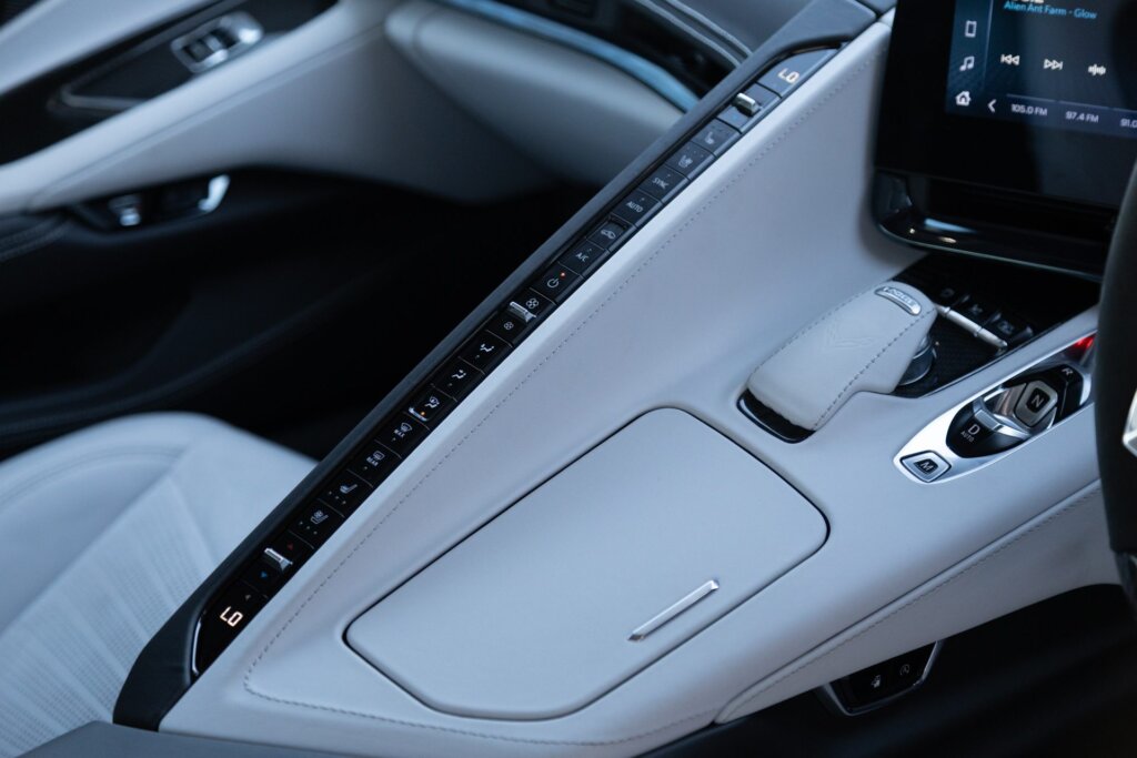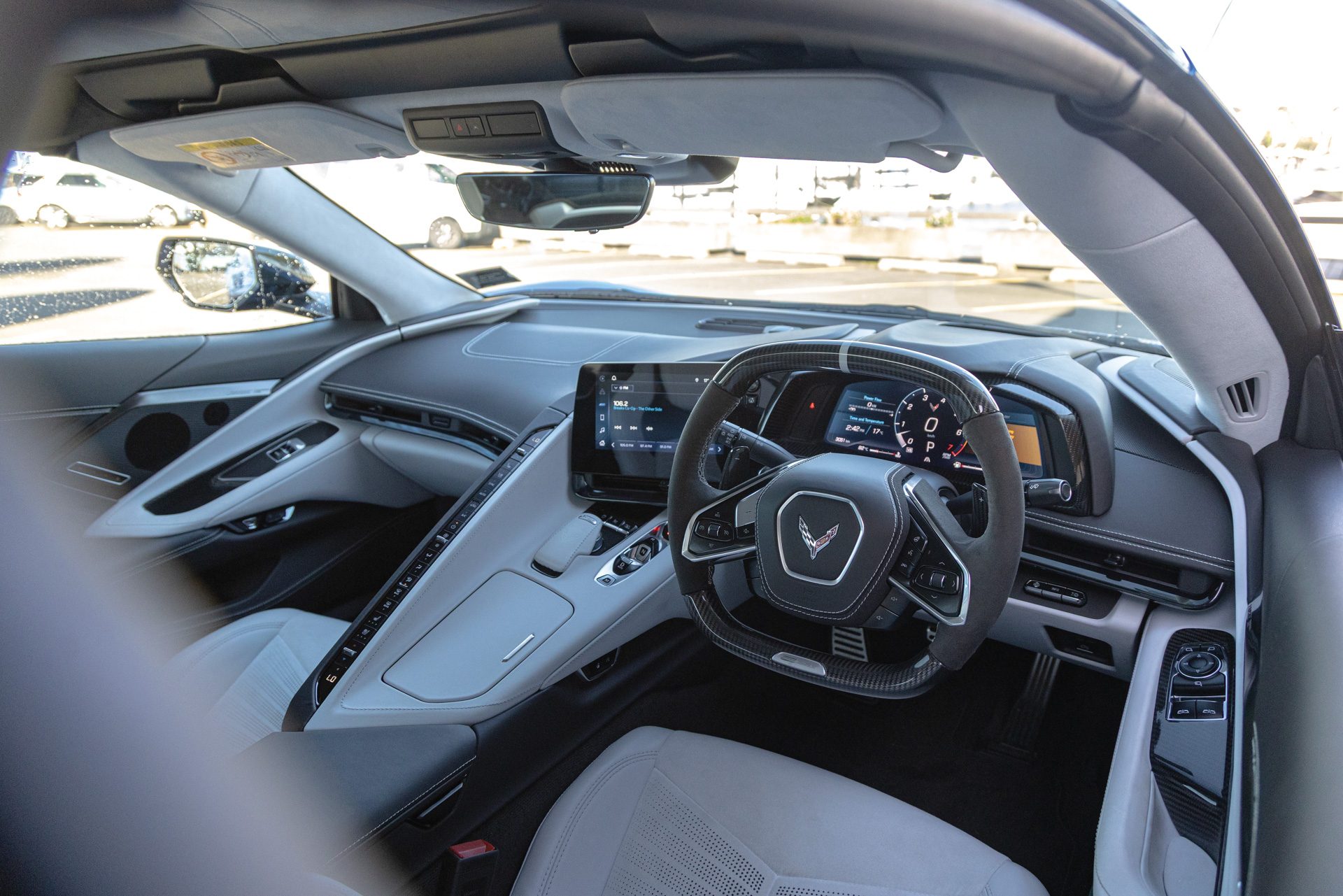 The Corvette is not perfect. While it’s nice to have the targa top configuration, it squeaks over the bumps. The row of HVAC switches is looking old now, and it needs a better drive mode button. The screen is a bit small too, with limited functionality. All of this is addressed with the new MY26 Corvette, which sees a revised console with larger cup holders, a toggle switch for the modes, the removal of the central divider and those buttons, and a whole lot more screenage. Both the infotainment and driver displays are bigger, and there is another under the A-pillar. Unfortunately they haven’t changed the square steering wheel in the upgrade. We wouldn’t go for this white interior either.