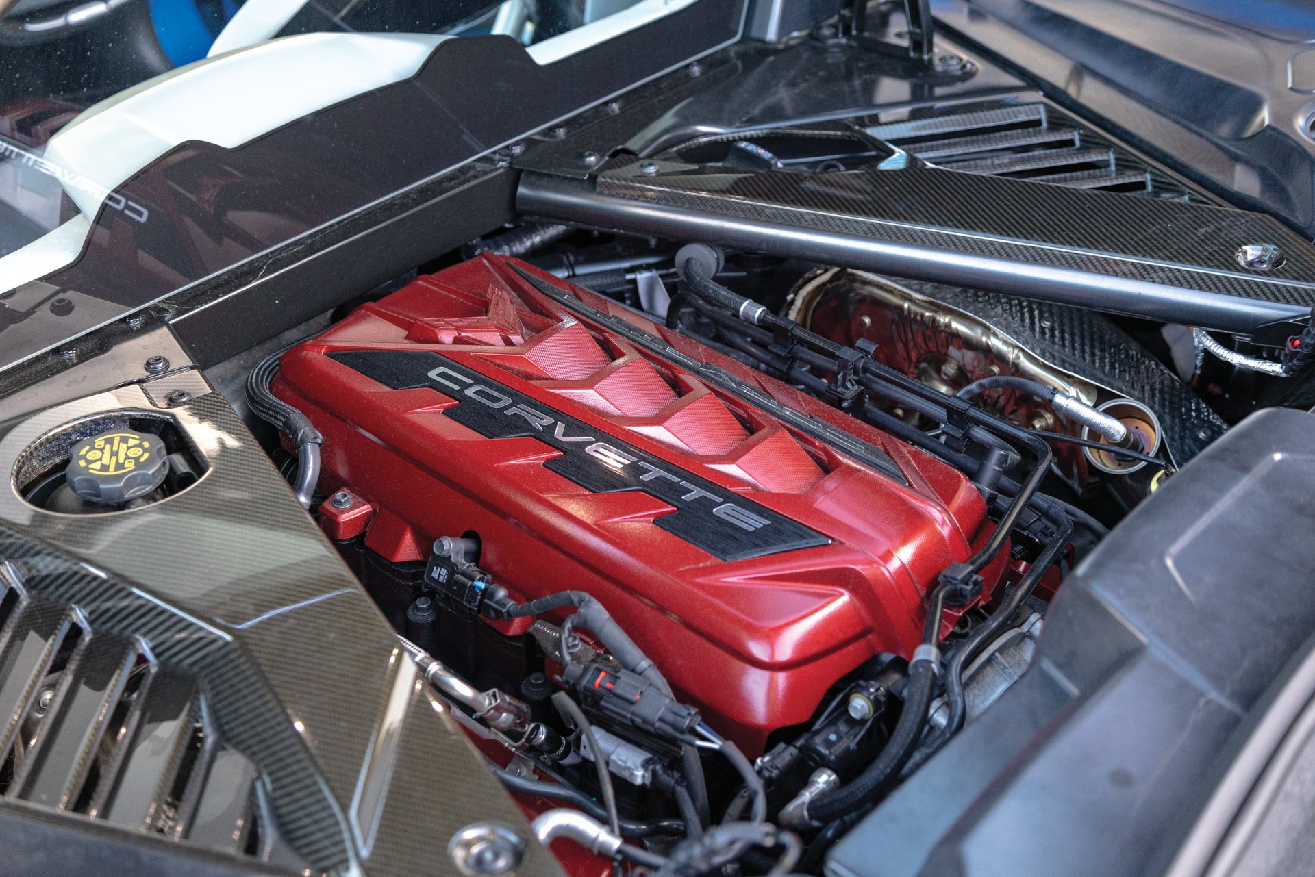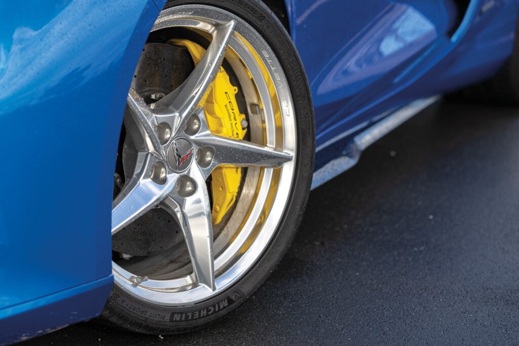 The E-Ray looks sensational, beating the 911 on showmanship. This has the same wide body as the Z06, looking properly supercar like. It’s striking in this hue, and even the chromed alloys (actually forged aluminum wheels in Pearl Nickel finish) look right, showing off those big carbon brakes.