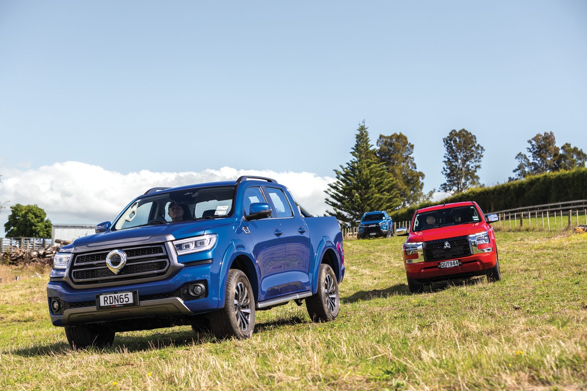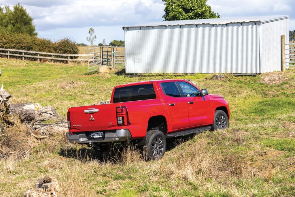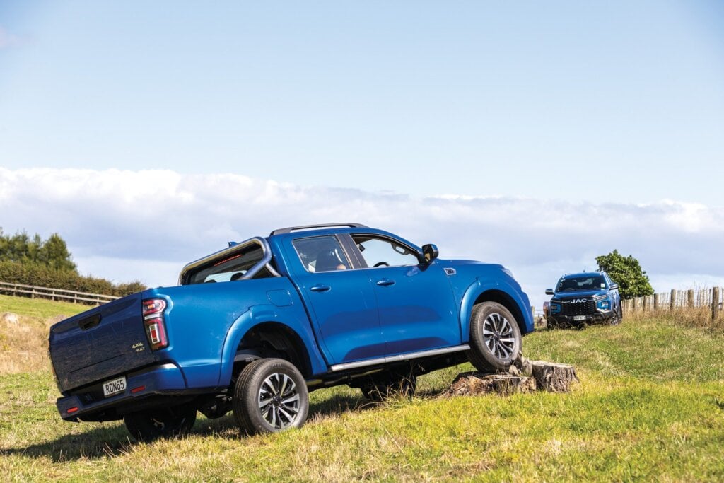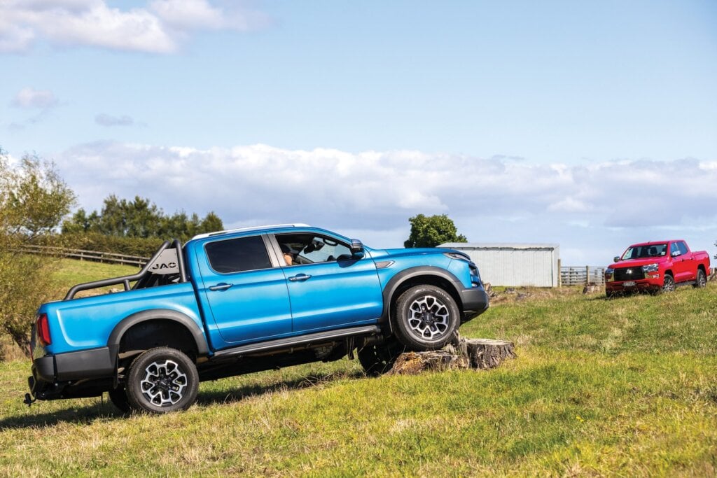 The Cannon’s on-demand system made harder work of the mild obstacles we faced on the farm; it’s harder to be smooth when slow and steady progress is required. Each has a diff lock helping them ease up on to the stump. The JAC has the most clearance at the front, the Triton the least, although the Mitsubishi’s 4×4 driveline made easier work of it all.