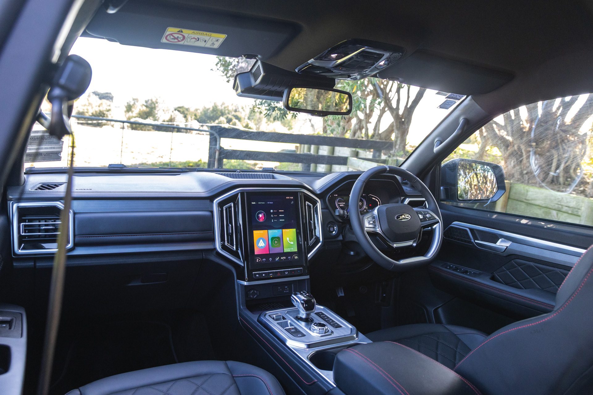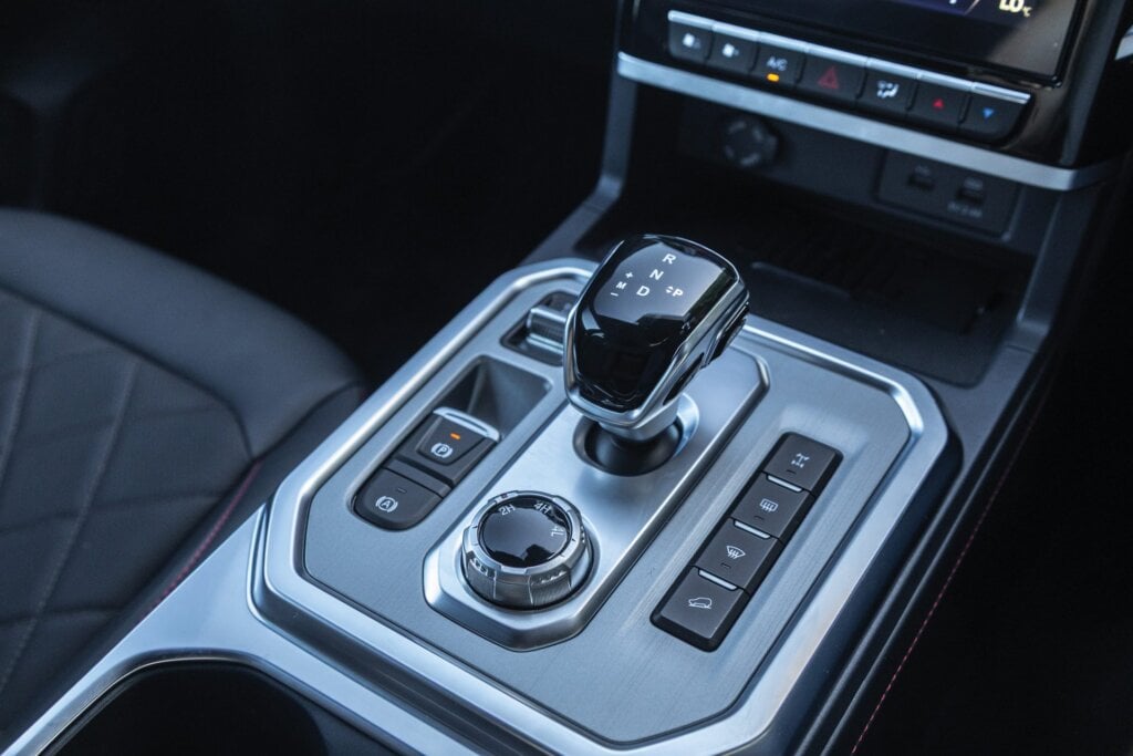 Some bits feel flimsy in the JAC’s interior, like the fuel cap release lever and 4×4 switch. The JAC’s cruise refused to work one day, then was fine the next, and the radio had a mind of its own, randomly changing stations. The interior detailing is flashy, the shiny bits reflecting the sun harshly. It has the largest screen, which is good for the surround view camera, though it’s also hampered by reflection. The 150W three-pin plug in the back might come in handy.