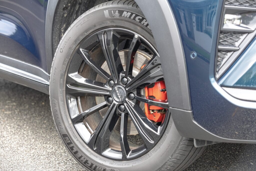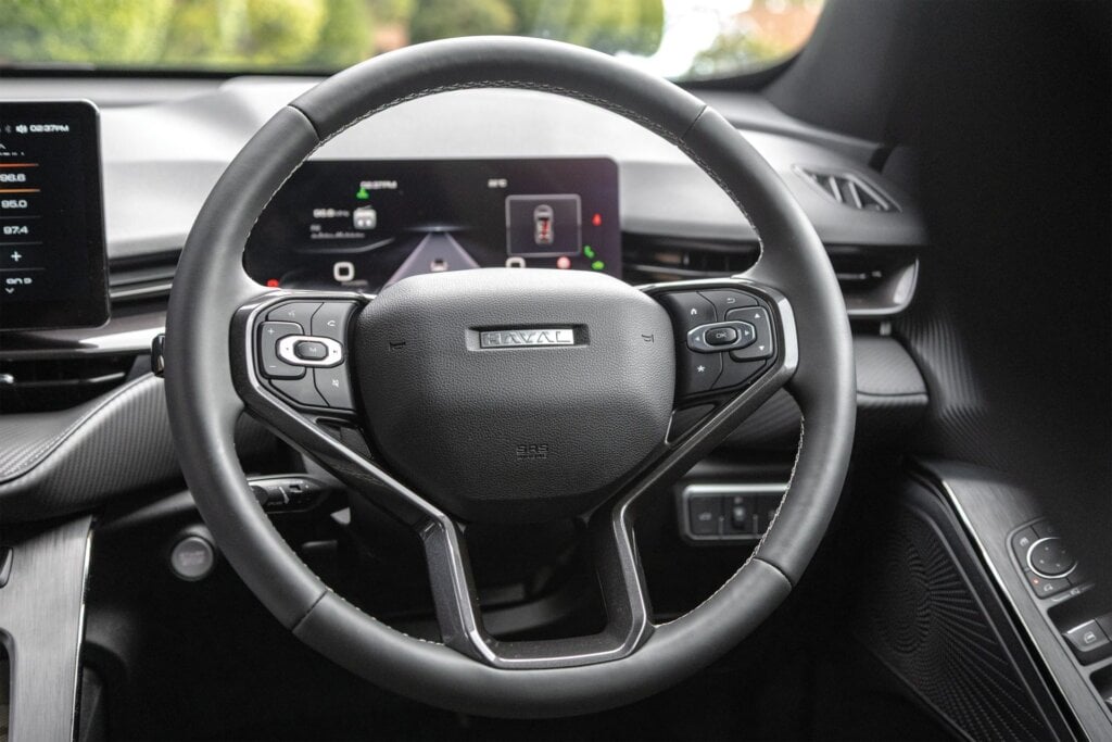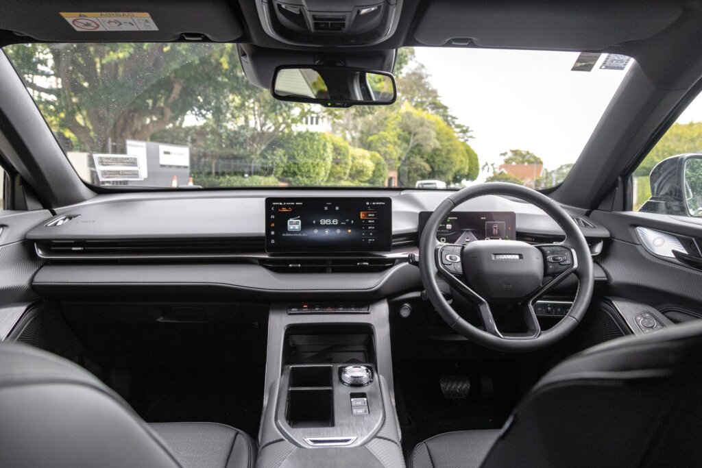 This isn’t quite as dynamic as the regular ICE-power H6 models, despite decent Michelin Primacy rubber and its AWD status. It can be a bit squirrely in the wet. GWM has fettled the suspension for the increased weight to make it ride appropriately, which it really does. Brakes are uprated too but have an odd pedal feel. No mind, because high-level recuperation does most of the braking for you.