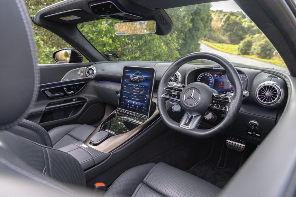 Anyhow, when we first drove the newcomer, now in its seventh generation, we were literally learning on the go. We couldn’t easily determine how to adjust the lumbar support, so we asked the MBUX assistant who quickly brought up the seat comfort screen. She’s helpful. Same for the motorised folding soft top. You just slide and hold the open icon on the menu. Fifteen seconds later, the car’s roofless. It takes the same to reverse the procedure and it can be done on the move, up to 60km/h. The new simpler system removes 21kg of weight compared with the former set-up too.