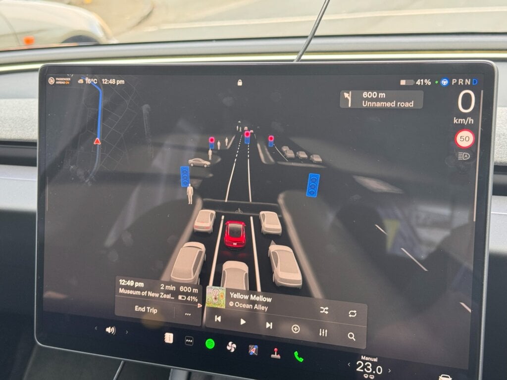 At Taupō, I stopped to recharge and grab a coffee. Getting out of the supercharger carpark, FSD simply couldn’t map its way through the tight rows and angled exits. I had to drive out manually. It’s a consistent weakness — anything off the official map, like carparks or private drives, confuses it completely.