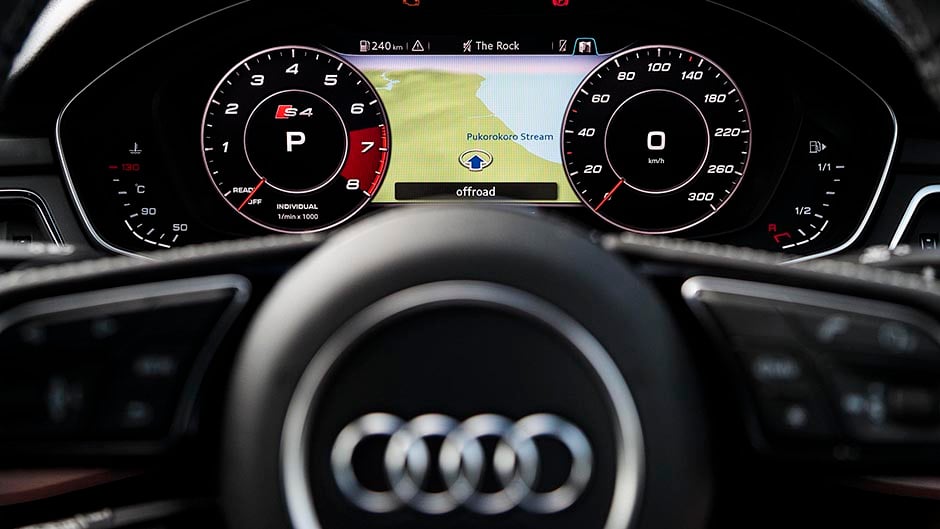The Audi also has heated sports seats with quilted leather, whereas the C 43 has them as part of an option pack. The latter also gets blacked out AMG styling, along with a 13-speaker Burmester sound system and performance brakes (drilled and vented) as standard whereas the black gloss styling package is a $1500 option on the S4. A Bang and Olufsen sound upgrade adds $3250 to the Audi. Metallic paint is a no-cost option on the S4, whereas on the C 43 the special white paint, performance ergonomic package, and seat comfort package took the cost from $119,400 to $127,670. The Audi, with its optional sports diff, dynamic steering, matrix LED headlamps and red brake calipers ended up slightly dearer at $129,550.