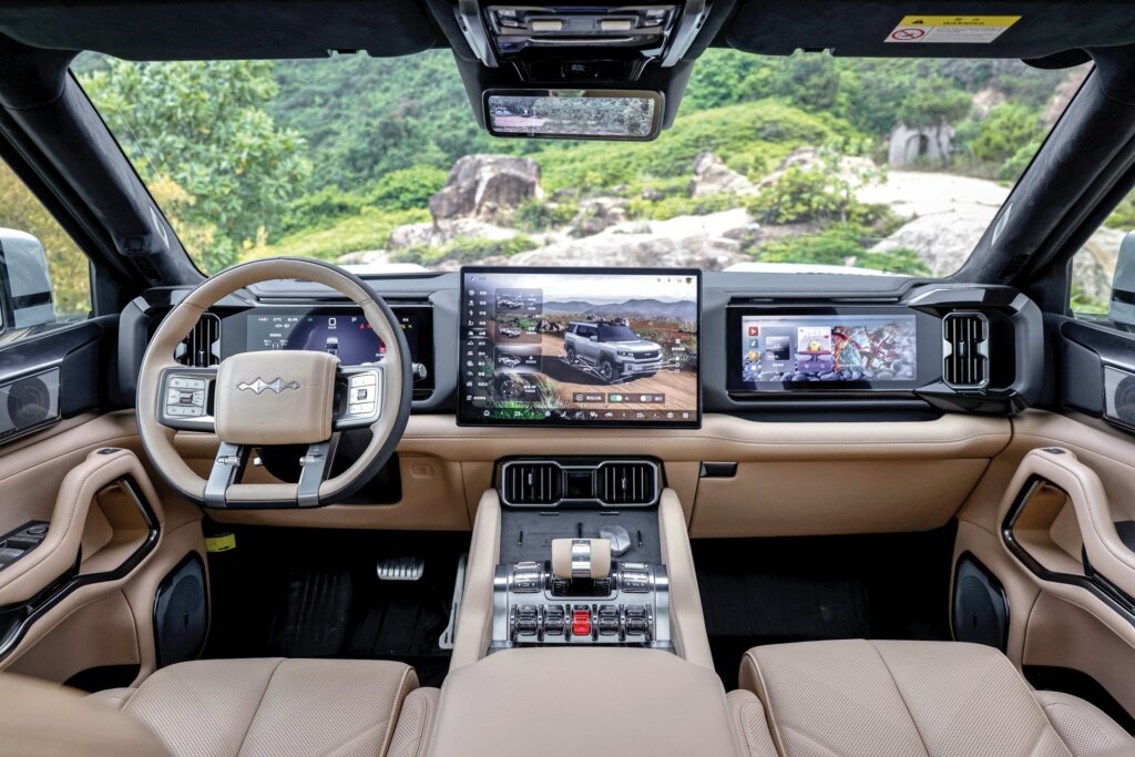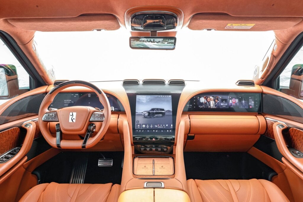 It’s huge, over two metres wide and packed with sensors, LiDAR and a satellite phone. The interior is stunning, with massage chairs, soft-touch materials, three large front screens and a rear-seat experience that outclasses many flagship German sedans.