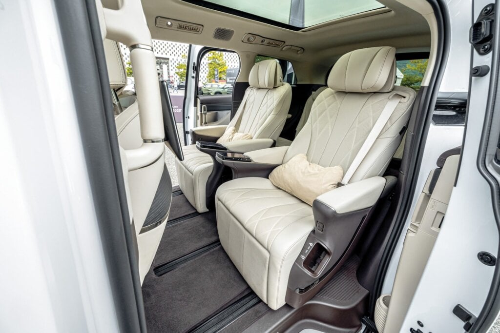 The interior ups the luxury significantly: there’s a full-width screen suite, pop-out sidesteps, an integrated fridge and rear-seat comfort worthy of a Lexus LX. It also offers flexible seating layouts, including a six- or seven-seat configuration and excellent third-row space.