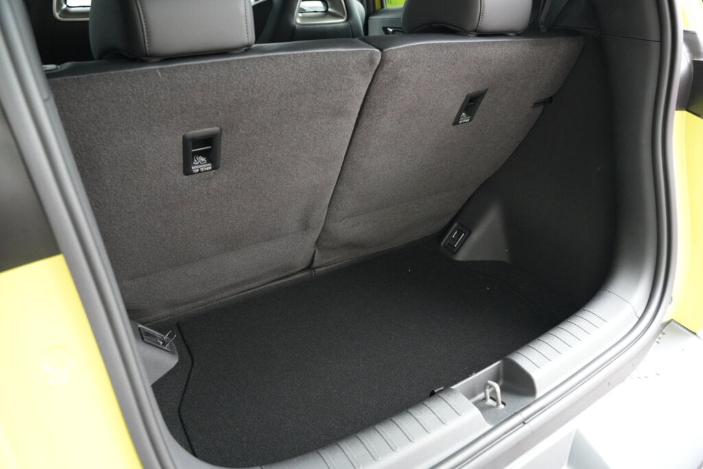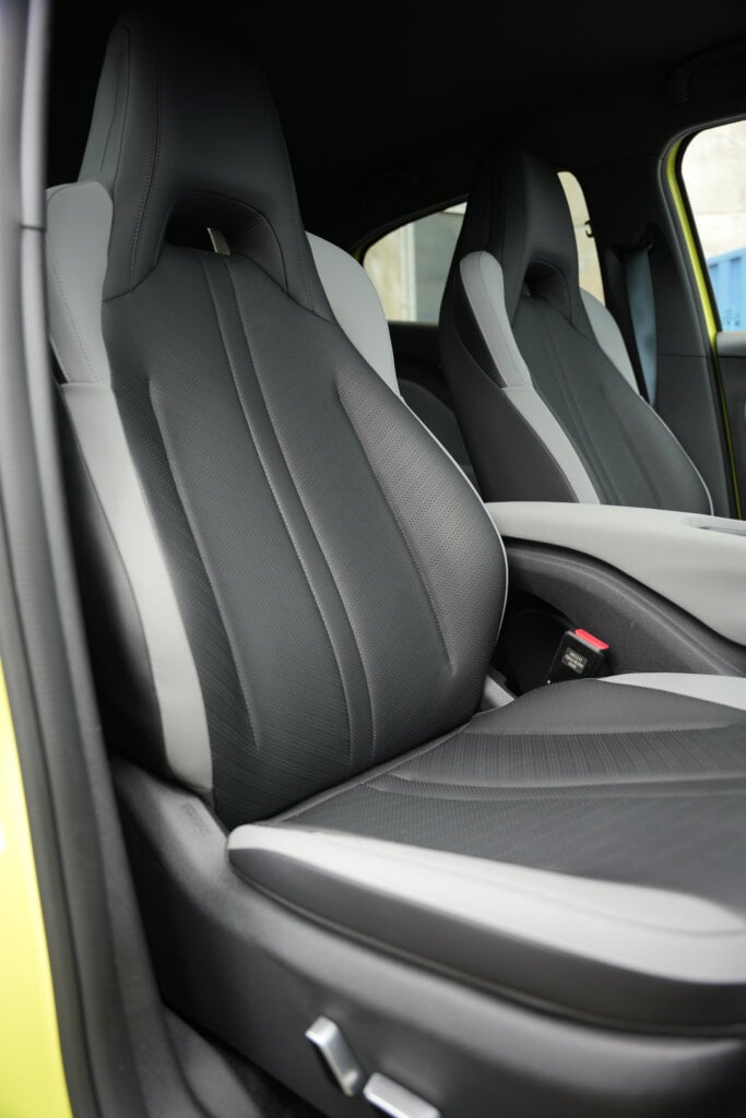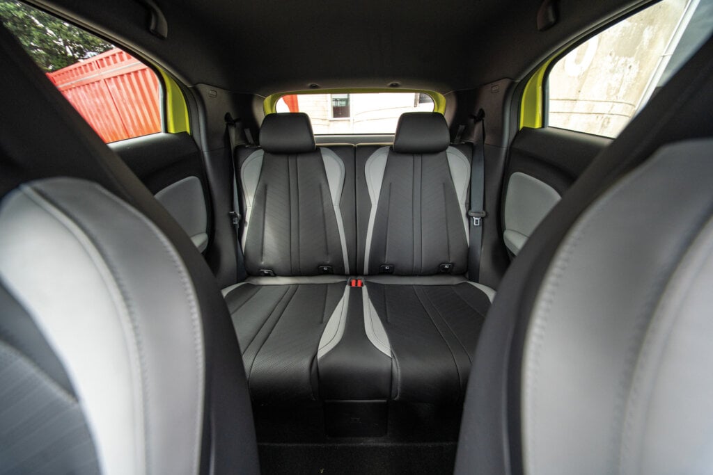 In the back, it very much passes the test. With the front seat set well back for a tall driver, there’s still loads of room. Knees don’t touch the seat ahead, there’s adequate headroom, and you get electric windows, not always a given in this class. The windows are quite high and narrow though, so little kids sitting low might struggle to see out. It is only a two-seater back here, making this a four-seater. There are no rear air vents, no armrest, and no cup holders, though bottle holders in the doors and a storage pouch help. With those big front seats creating a bit of a wall, you might need to pump the air harder up front to keep rear passengers comfortable.
