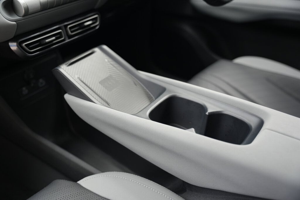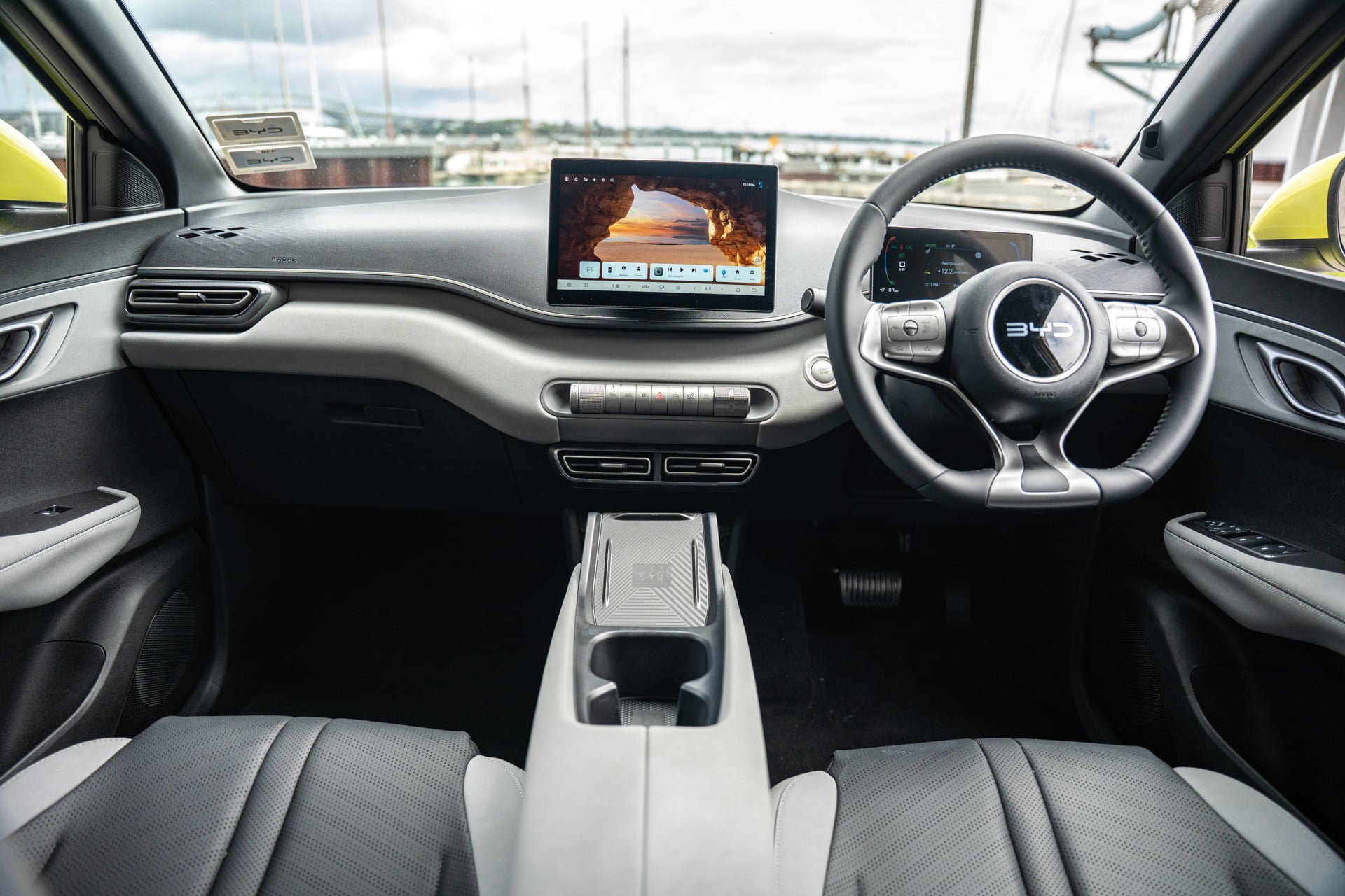 The seven-inch instrument cluster does the job, and the familiar BYD steering wheel controls handle media, calls, and adaptive cruise. The drive selector is the same dial as the Dolphin. Up and down for reverse and drive is great, though selecting park from the side can feel a bit awkward. There’s a wireless charger, cup holders that could use some lining to stop bottles rattling, USB-A and USB-C, and a glove box. No centre console storage box though, just open space underneath.