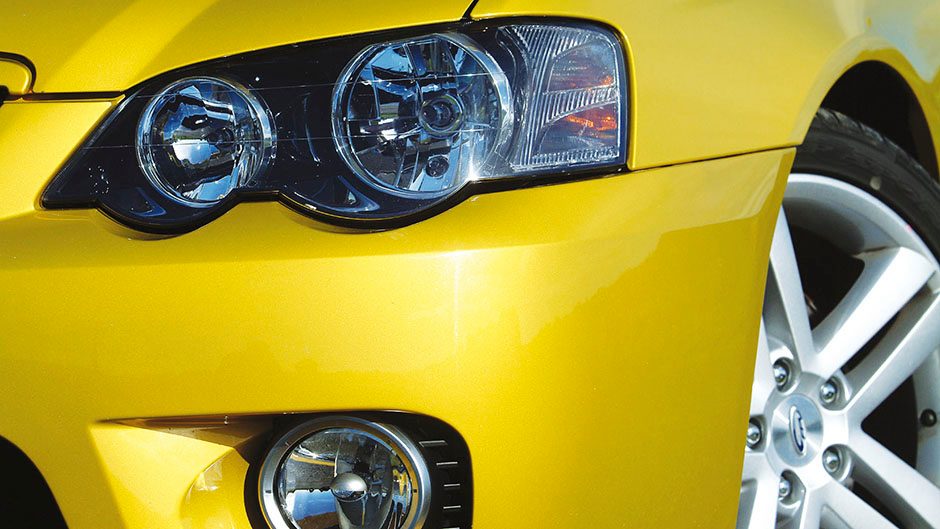 Are things getting weirder at HSV since ring-in designer, Ian Callum, left for Jaguar pastures? Will we remember the last Callum-shaped Clubsport – the VX version – as the prettiest? The latest VY Clubsport is as radical to view as any Bangle-Beemer, with its vertically-slotted bumpers and a front bib that looks like it’s already lost an argument with a telephone pole. Meanwhile, Ford errs on the side of conservatism with the FPV GT. Although the front bumper adds pizzazz (looking for all the world like an enlarged version of that of the Focus ST170) and the substantial rear wing an ambience of Bathurst in October, the side skirts are less aggressive-looking than the XR8’s. Meanwhile, the FPV’s 18” wheels are the same size as those worn by a Commodore SS.