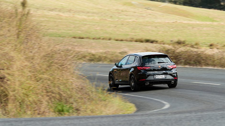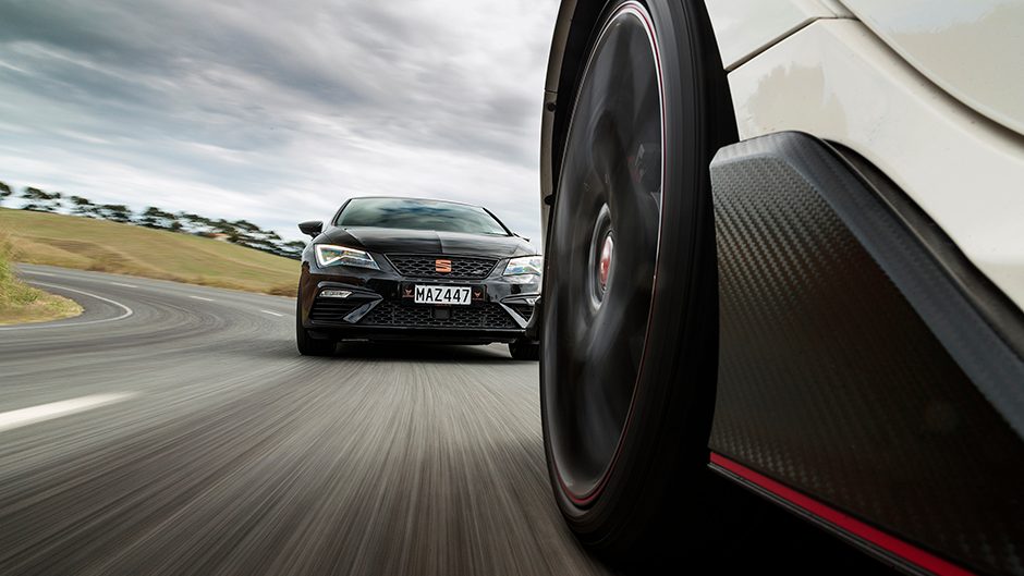 With the rapid shifting twin clutch taking care of the gears, you can concentrate on getting those corner entry points right, for it can’t hold the same load in the bend as the others. For the photos we used a gnarly corner that turns back on itself, one that really works the treads. The Honda emitted a mere squeak from the front as it rounded the corner at the legal limit. The RS came close to emulating that velocity but was beginning to inch closer to the shoulder line while the Cupra was 15km/h slower, having to ease off the gas to keep it safely from crossing the line.