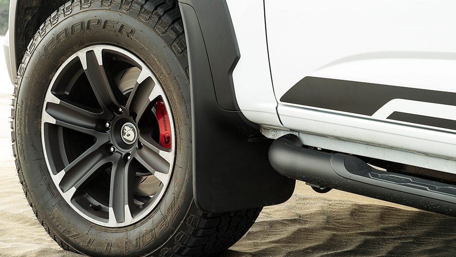 The new springs lift the front by 25mm to level off the stance and they improve the approach angle to 32 degrees. The wheels are 18-inch forged items and come wrapped in a Cooper ‘Sports All-Terrain’ tyre that was specifically developed for HSV to deliver both the added on-road grip and off-road capability they were looking for. Mounted on an offset, the track increases by 30mm, while the bigger tyres add further ground clearance, measuring a total of 251mm. The ESP has been retuned to suit as well.