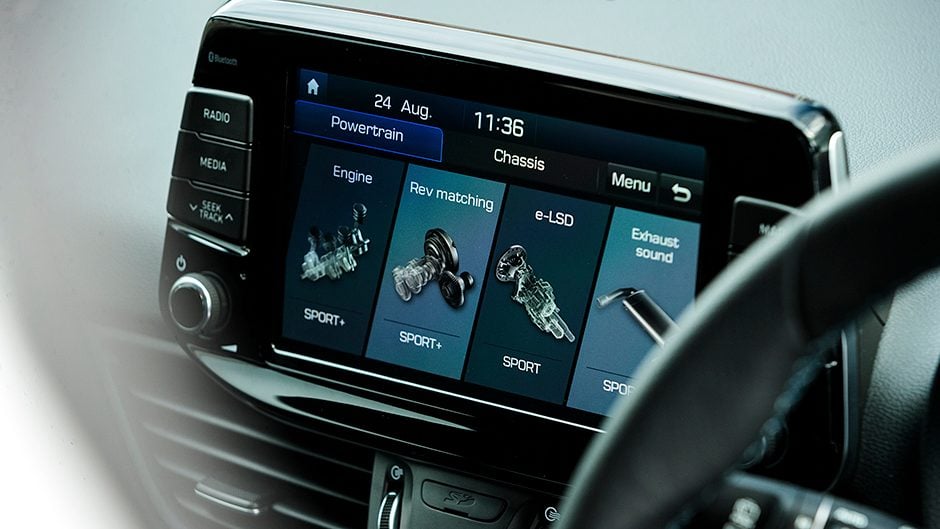 Inside it’s subtle too. The seats are trimmed in microfibre and are supportive in all the right places, yet the bolstering won’t cause any bruising on entry. There’s good adjustment too. It’s otherwise pretty standard i30 fare, save for the instrument panel with its variable shift lights and the sports wheel with its drive buttons. There are the usual convenience features and a few active safety helpers, with AEB and lane keeping, though active cruise is missing.