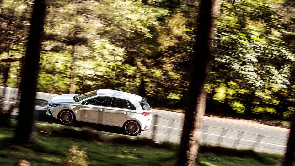 Into roads proper, we access N mode for max attack and everything begins to gel more effectively, with the engine reaction spiked further and the i30 locked down. The continuously variable nature of the dampers allows the Sport Plus setting to work on road too, the N flowing compliantly over undulating trails.