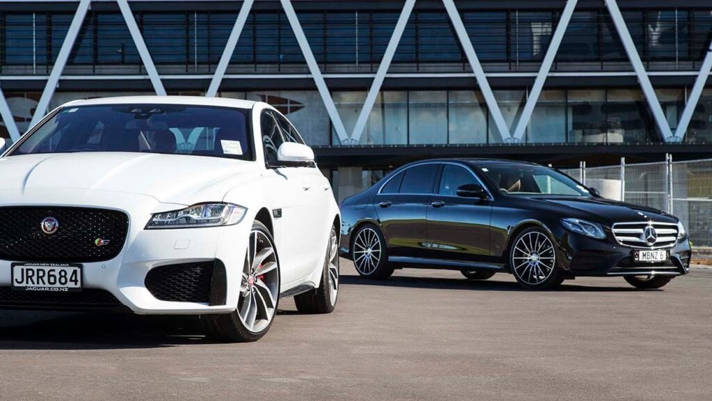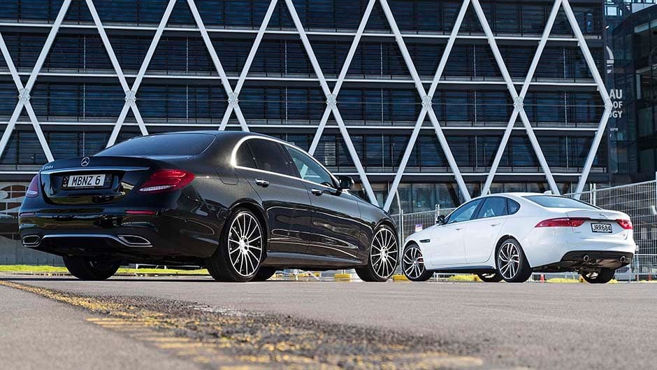 In the vehicular world that’s subject to the whims of fashion, cars like these are not quite the hot items they once were, at least not in New Zealand and we’ve the rise of the luxury SUVs to thank for that. However, not all succumb to the temptations of high-riding vehicles, and there are those who choose to pilot ever-more competent medium-sized luxury saloons like Jaguar’s second-generation XF and Mercedes-Benz’ fifth-generation E-Class. We’ve been driving the top diesel variants of each range, both packing a 3.0 V6 diesel. In neither case are they new mills, unlike the smaller diesels also available in this pair.