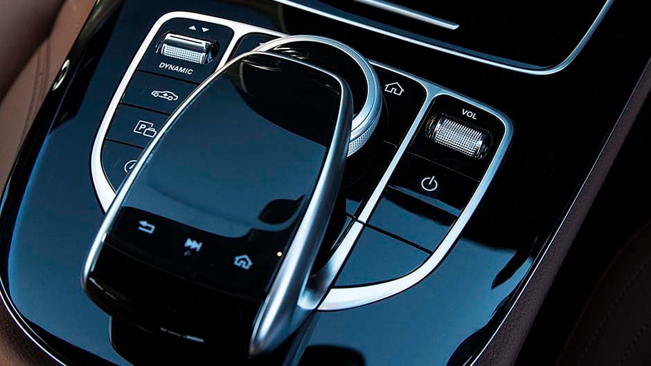 Instead, most of the minor functions are relegated to touch screen control. Gear selection in the German car is a little different too; as in S- and C-Class, you choose gear settings from the right wand attached to the steering column. The Mercedes interior is replete with gear, some of it dedicated to autonomous functions, and the car tends more towards the luxury end of the ledger, whereas the Jaguar cabin is slightly more sports oriented, with as much alcantara-type surfacing as leather.