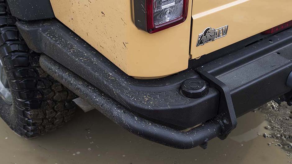 AEV mess with the underpinnings too, fitting what it calls ‘DualSport’ suspension systems to work better off-road while retaining some semblance of on-road refinement. It’s raised up 63mm to see ground clearance of 271mm measured to the bottom of the front axle. The 17-inch alloys allow for low pressure operation without the tyre coming off the rim, and come fitted with 35-inch (that’s how tall the tyre is) mud pluggers which measure more than a foot across. Optional for US buyers is a 115mm lift and 37-inch tyres, though you’d probably need a step ladder to help you climb aboard.