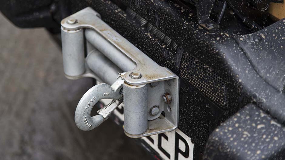 On the rear there’s a unique bumper with some serious steel tubing and an inbuilt 26L water tank, should you get thirsty when stranded in the wilds. The quoted 32 degree departure angle is compromised here by the low hanging tow bar. We wouldn’t bother as the Brute is rated to ‘haul’ just 1590kg. Up front the stamped steel bumper contributes to an approach angle of 57 degrees and comes complete with a Warn winch and blindingly bright spot lights.