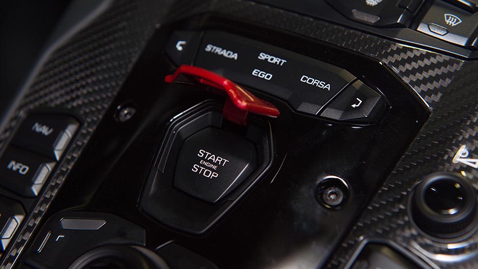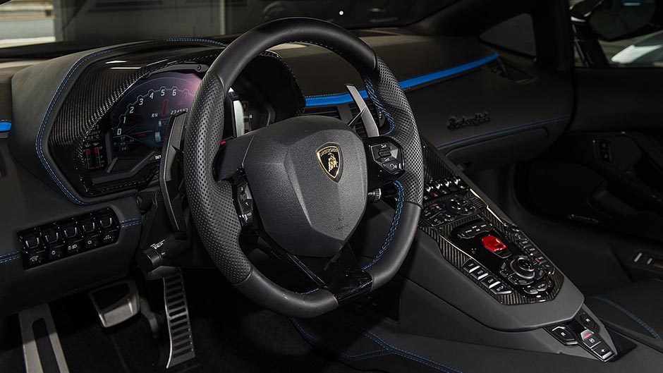 There are now more active systems on board, including rear-wheel steering. With new knuckles and two electrically actuated motors on the lower rear suspension arm, the rear wheels can move either in the opposite direction to the fronts at lower speeds, or move in the same direction at higher speeds. Combined with variable ratio steering (a quick 2.2 turns lock-to-lock), it makes the Aventador turn more easily, while the virtual lengthening of the wheelbase at higher speeds in longer sweepers aids stability. We wound the car through a slalom on a wet skid pan and could certainly feel the benefits of the rear wheels lending a hand to get around the tight turns more easily, while the quick steering relieves the pressure on the arms.