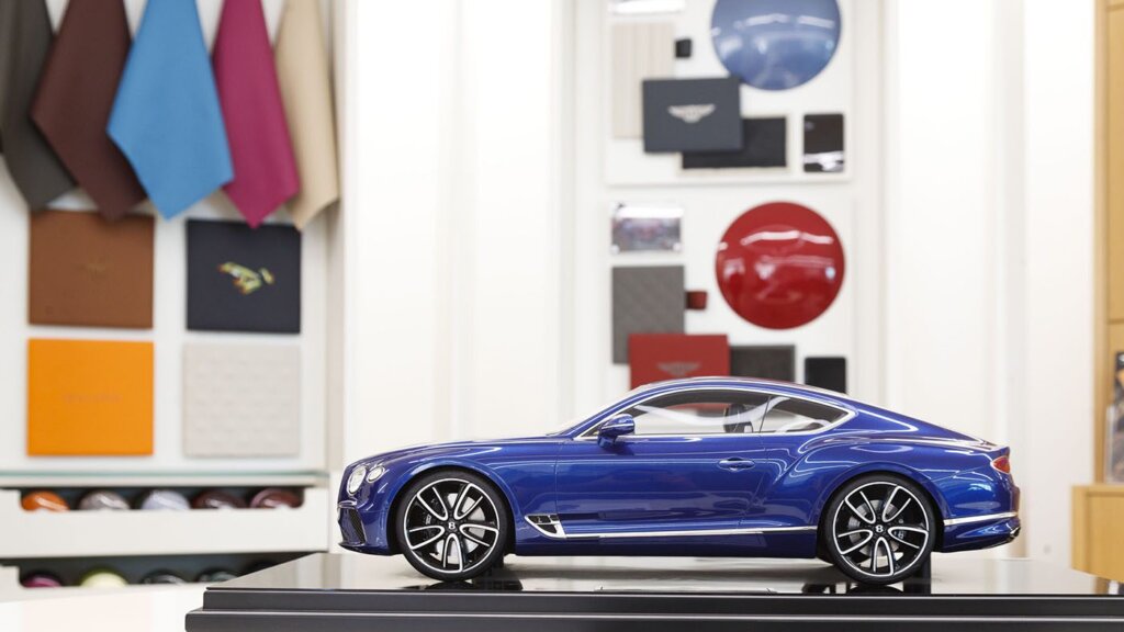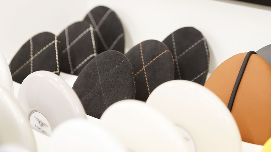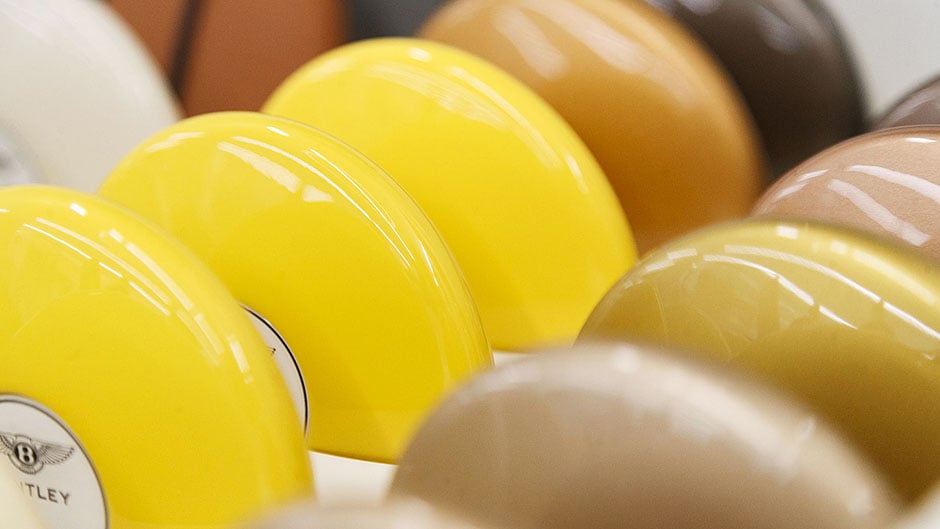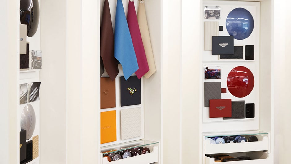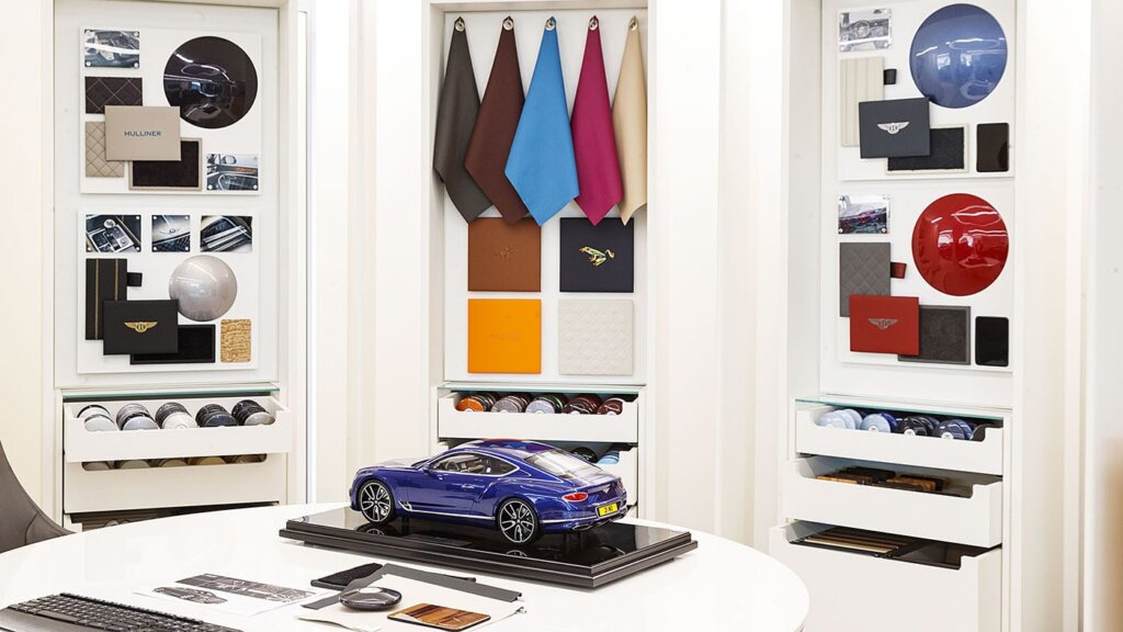 Typically, a Bentley buyer will spend around two and half hours going through the specifying process using the configurator and some help from the mood boards and leather samples in the dealership’s configuration suite. Here they can see the colour combinations working together, or clashing. It also gives them a chance to see their colour selection under differing lights, the paint pebbles allowing the light to dance over the curved surface.