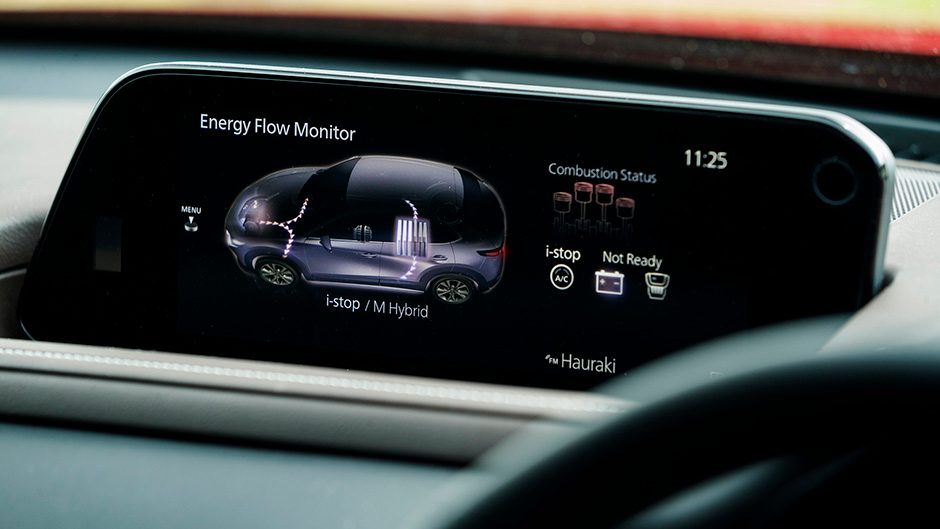 Driving with a thought to economy, the Takami’s trip computer indicated an average of 7.3L/100km for urban running, which included a few easy motorway miles in the mix. There’s an infographic showing you what mode the engine is operating in, which for the most is SPCCI, only reverting to conventional spark under full load. After some more spirited running, the average was up to 8.1L/100km. Looking back at our report on the CX-30 2.5, we noted consumption of 9.2L/100km.