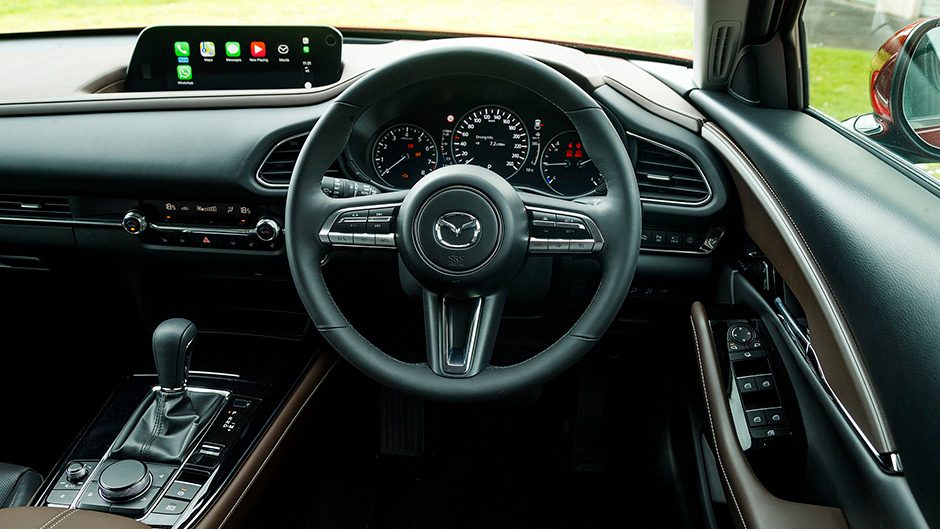 This rides and drives well too. Not quite like a Mazda3 however, it understeers sooner and leans that bit more in the turns. But the steering is thoughtfully conceived, and the chassis has a deft mix of refinement and connection. The CX-30 has the full serving of Mazda’s safety minders. Initially these were set to maximum awareness; cue insistent warnings, beeps and bongs. It was the Mazda that cried Wolf, but it took just a few moments (once parked up) to delve into the submenus to calm its nerves.