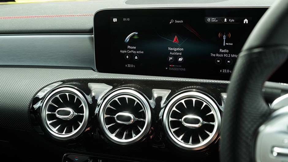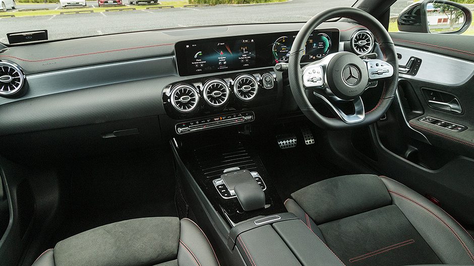 The driver fares pretty well too, though we keep wishing Mercedes would install some kind of left knee brace rather than just a hard plastic centre console edge. Even so you’re well locked in place, the seat well shaped, with stupendous amounts of lumbar adjust for those with lower back problems. Pity you can’t plumb the depths a bit more, but then rearward visibility is bad enough because of the low roof, tiny glasshouse and sizeable C-pillar. As it is, you tend to rely heavily on the external mirrors which fortunately feature blindspot monitoring. When you open your door at a standstill, the car alerts to traffic approaching from behind. It can also auto-slow for intersections or roundabouts when guided by sat nav.