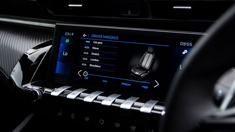 One of the few changes Peugeot has recently made to the 508 is the quiet delete of its ‘i-Cockpit Amplify’ menu layout and option-set in the main screen. This used to be the 508’s supposed luxury party piece — a chunk of its infotainment that housed a ‘Relax’ and a ‘Boost’ mode for drivers to pick from, each altering a range of settings like air conditioning and the massaging seats to fit the driver’s ‘mood’. It was rather gimmicky and I’m therefore thankful it’s gone; replaced by a conventional ‘Settings’ button on the 508’s piano-key arrangement with the massaging seats for both driver and front passenger now activated by a simple button on the side of each front-mounted pew.