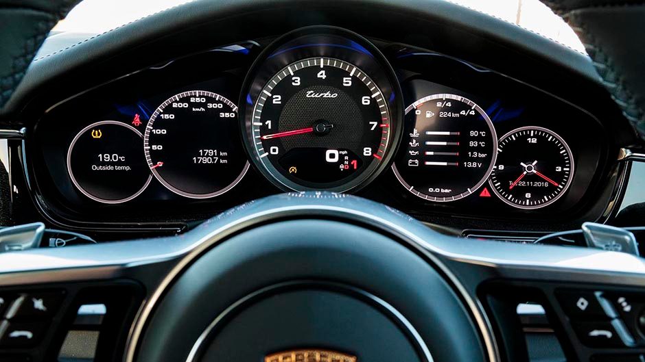 While it’s hard to get a grasp on its character with just a few quick laps around the track, we can tell you it feels well balanced, the substantial weight distributed between the wheels. There’s abundant grip when given the welly. We managed to bag a few laps in the new Cayman during the same session and any of the bumps we felt in the mid-engined sportscar were simply glossed over in the big limo. That said, the AWD system still had a hard time dealing with the substantial bump coming out of the tight hairpin at Turn 4, a hesitation on exit the result of traction control intervening. The steering is remarkably light but gets just enough resistance in bends to help impart some feel. The PDK always does a phenomenal job in flat-chat mode; you just let it do its thing. The V6 in the 4S has reasonable get up and go, but it offers nothing like the punch of the Turbo, the extra Newts giving you a much bigger lunge out of bends.